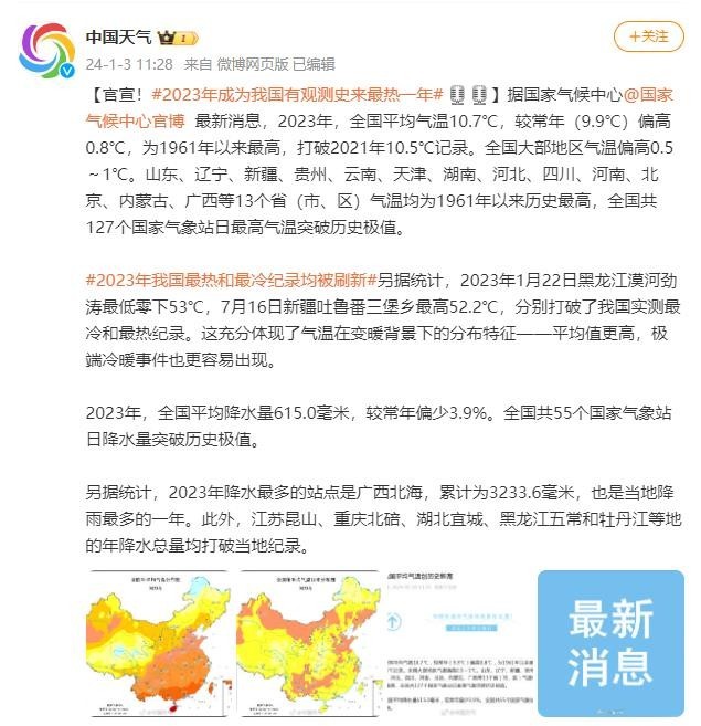 央視網(wǎng)消息:中國天氣 援引國家氣候中心國家氣候中心官博 最新消息,2023年,全國平均氣溫10.7℃,較常年(9.9℃)偏高0.8℃,為1961年以來最高,打破2021年10.5℃記錄。全國大部地區(qū)氣溫偏高0.5~1℃。山東、遼寧、新疆、貴州、云南、天津、湖南、河北、四川、河南、北京、內(nèi)蒙古、廣西等13個省(市、區(qū))氣溫均為1961年以來歷史最高,全國共127個國家氣象站日最高氣溫突破歷史極值。
