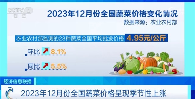 2023年12月份,農業(yè)農村部監(jiān)測的28種蔬菜全國平均批發(fā)價格為每公斤4.95元,環(huán)比上漲8.1%,同比上漲5.5%。其中,24種蔬菜價格環(huán)比上漲,4種下降。環(huán)比漲幅超過30%的有韭菜、茄子、青椒等。
