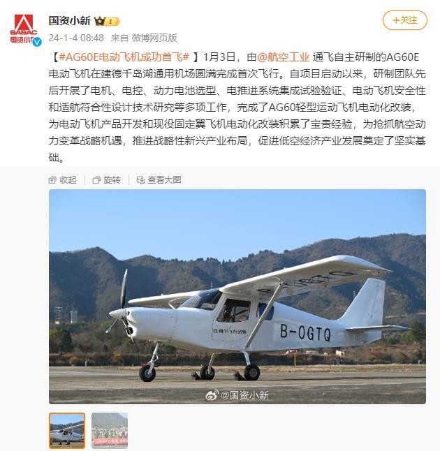 央視網(wǎng)消息:據(jù)@國(guó)資小新 消息,1月3日,由@航空工業(yè) 通飛自主研制的AG60E電動(dòng)飛機(jī)在建德千島湖通用機(jī)場(chǎng)圓滿完成首次飛行。自項(xiàng)目啟動(dòng)以來(lái),研制團(tuán)隊(duì)先后開(kāi)展了電機(jī)、電控、動(dòng)力電池選型、電推進(jìn)系統(tǒng)集成試驗(yàn)驗(yàn)證、電動(dòng)飛機(jī)安全性和適航符合性設(shè)計(jì)技術(shù)研究等多項(xiàng)工作,完成了AG60輕型運(yùn)動(dòng)飛機(jī)電動(dòng)化改裝,為電動(dòng)飛機(jī)產(chǎn)品開(kāi)發(fā)和現(xiàn)役固定翼飛機(jī)電動(dòng)化改裝積累了寶貴經(jīng)驗(yàn),為搶抓航空動(dòng)力變革戰(zhàn)略機(jī)遇,推進(jìn)戰(zhàn)略性新興產(chǎn)業(yè)布局,促進(jìn)低空經(jīng)濟(jì)產(chǎn)業(yè)發(fā)展奠定了堅(jiān)實(shí)基礎(chǔ)。