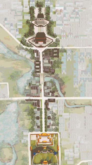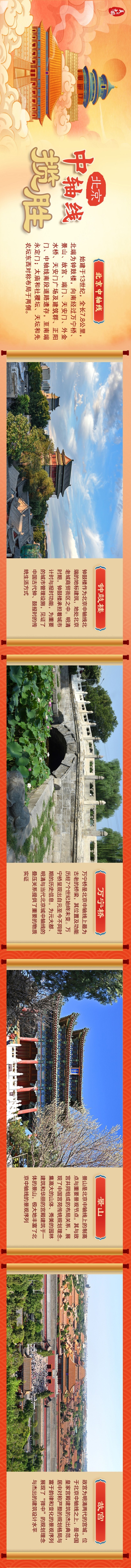 全長7.8公里的北京中軸線北端為鐘鼓樓,向南經過萬寧橋、景山、故宮、端門、天安門、外金水橋、天安門廣場及建筑群、正陽門、中軸線南段道路遺存,至南端永定門;太廟和社稷壇、天壇和先農壇東西對稱布局于兩側。