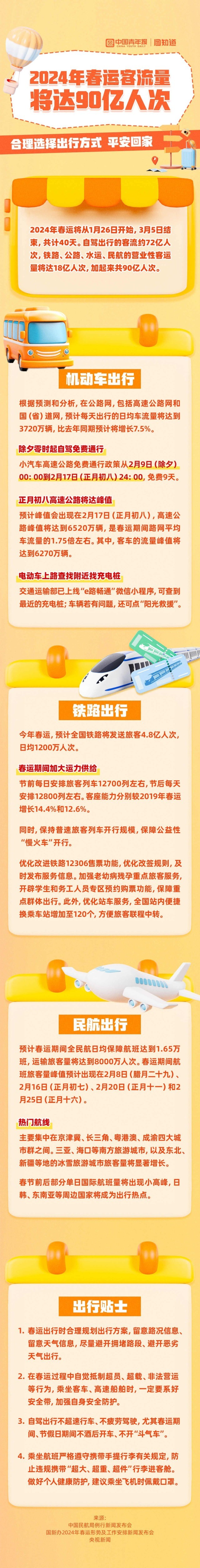 2024年春運(yùn)將從1月26日開(kāi)始,全社會(huì)跨區(qū)域人員流動(dòng)量將創(chuàng)歷史新高。春運(yùn)期間:①除夕零時(shí)起自駕免費(fèi)通行;②鐵路全國(guó)站內(nèi)便捷換乘車站增加至120個(gè);③民航國(guó)內(nèi)熱門(mén)航線集中在京津冀、長(zhǎng)三角、粵港澳、成渝四大城市群之間。你會(huì)選擇那種方式回家過(guò)年?點(diǎn)擊長(zhǎng)圖,一起了解春運(yùn)出行保障。