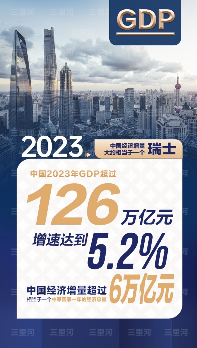 2023年中國(guó)經(jīng)濟(jì)年報(bào)顯示,全年GDP超過126萬(wàn)億元(人民幣,下同),增速達(dá)到5.2%。按照可比價(jià)計(jì)算,2023年中國(guó)經(jīng)濟(jì)增量超過6萬(wàn)億元,相當(dāng)于一個(gè)中等國(guó)家一年的經(jīng)濟(jì)總量。