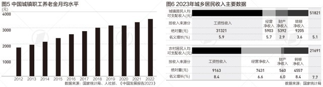 從近年來中國居民人均可支配收入水平及增速變化來看,2018年、2019年居民人均可支配收入實際增速為6.5%、5.8%;2020年突遇疫情之后,降至2.1%,隨著2021年經濟的恢復,又升至8.1%,2022年又回落到2.9%,經歷了一波過山車般的行情后,2023年為6.1%,回歸了較為正常的區(qū)間。