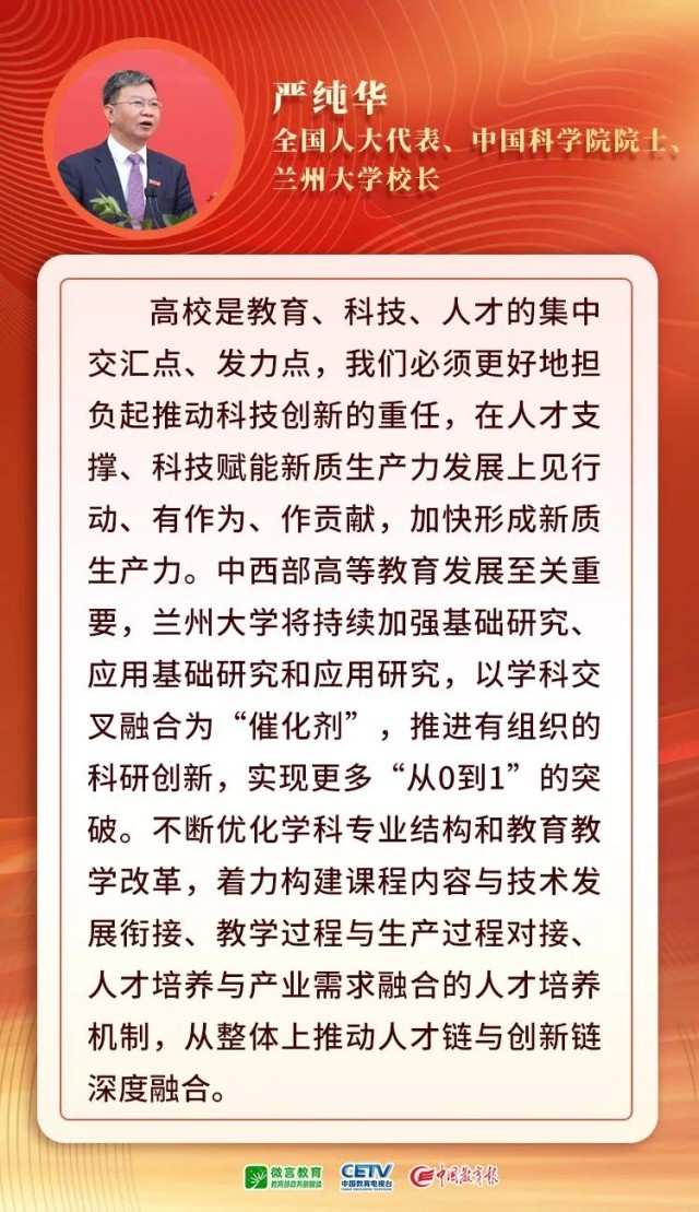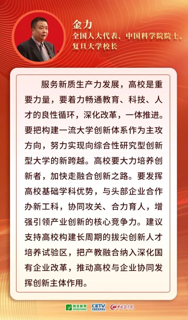 2024年政府工作報(bào)告提出,大力推進(jìn)現(xiàn)代化產(chǎn)業(yè)體系建設(shè),加快發(fā)展新質(zhì)生產(chǎn)力。培育和發(fā)展新質(zhì)生產(chǎn)力,創(chuàng)新是核心要素,基礎(chǔ)和先導(dǎo)靠教育。高校如何發(fā)揮支撐作用,推動(dòng)新質(zhì)生產(chǎn)力發(fā)展?5位代表委員,同時(shí)也是大學(xué)書記、校長,提出了建議,來聽他們怎么說——