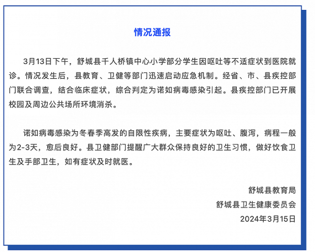 安徽舒城通報(bào)一小學(xué)多名學(xué)生腹痛嘔吐:綜合判定為諾如病毒感染引起