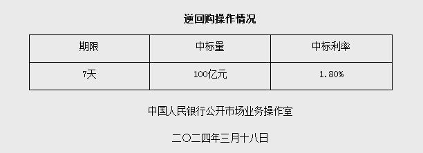 中新網(wǎng)3月18日電 據(jù)中國人民銀行網(wǎng)站消息,為維護銀行體系流動性合理充裕,2024年3月18日人民銀行以利率招標方式開展了100億元逆回購操作。具體情況如下: