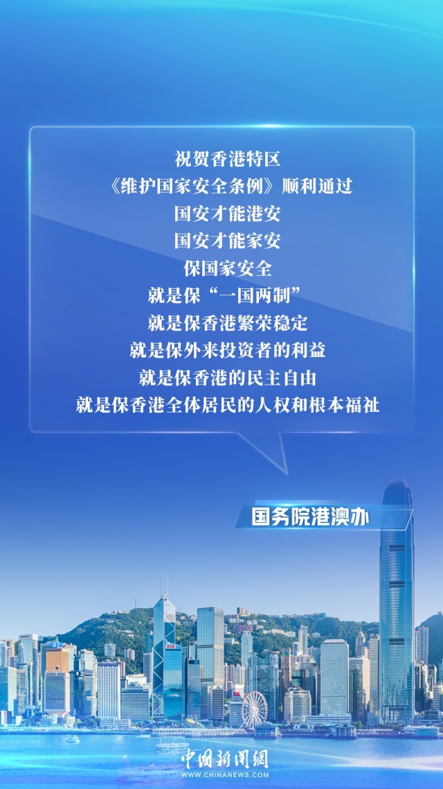 國務(wù)院港澳辦強(qiáng)調(diào),香港國安條例順利通過,為保持香港長期繁榮穩(wěn)定、推動(dòng)“一國兩制”實(shí)踐行穩(wěn)致遠(yuǎn)提供更加堅(jiān)實(shí)的制度保障。香港國安條例全面有效維護(hù)國家安全,充分尊重和保障人權(quán),更好統(tǒng)籌發(fā)展和安全。