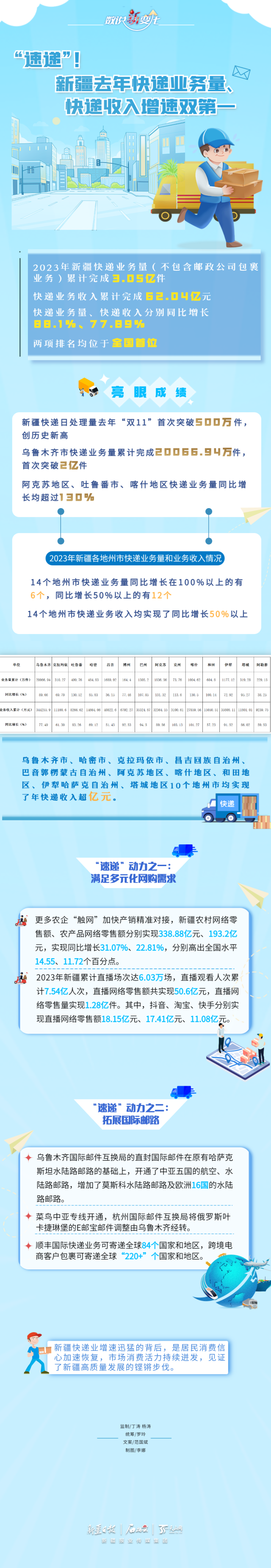 近日,國家郵政局公布2023年郵政行業(yè)運行情況,從快遞業(yè)務量和收入的增速指標看,新疆排名均位于全國首位。快遞是反映經濟活力的“晴雨表”,全疆各地取得哪些成績?快遞業(yè)增速迅猛的背后有哪些原因?今天的《數說“新”變化》帶你感受新疆“速遞”!