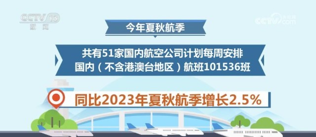 今年夏秋航季,共有51家國(guó)內(nèi)航空公司計(jì)劃每周安排國(guó)內(nèi)(不含港澳臺(tái)地區(qū))航班101536班,同比2023年夏秋航季增長(zhǎng)2.5%。其中,客運(yùn)航班每周98655班,同比2023年夏秋航季增長(zhǎng)2.17%。在新開(kāi)辟航線方面,35家航空公司在新開(kāi)的國(guó)內(nèi)683條獨(dú)飛航線上每周共安排6529個(gè)航班運(yùn)營(yíng),主要包括中衛(wèi)、吐魯番、庫(kù)車等支線機(jī)場(chǎng)與北京、上海、廣州、成都等樞紐機(jī)場(chǎng)間的干支銜接航線和支線航線。