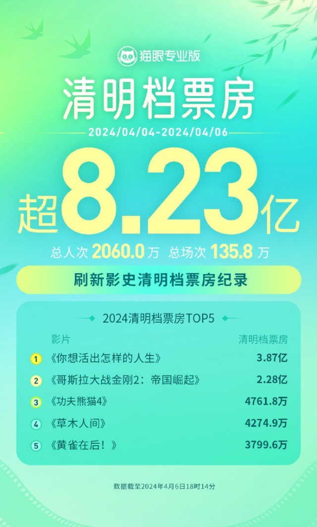 央視網(wǎng)消息:據(jù)貓眼專業(yè)版數(shù)據(jù),截至4月6日18時14分,2024年清明檔(4月4日—4月6日)總票房突破8.23億,超2021年清明檔票房成績,刷新中國影史清明檔票房紀(jì)錄。