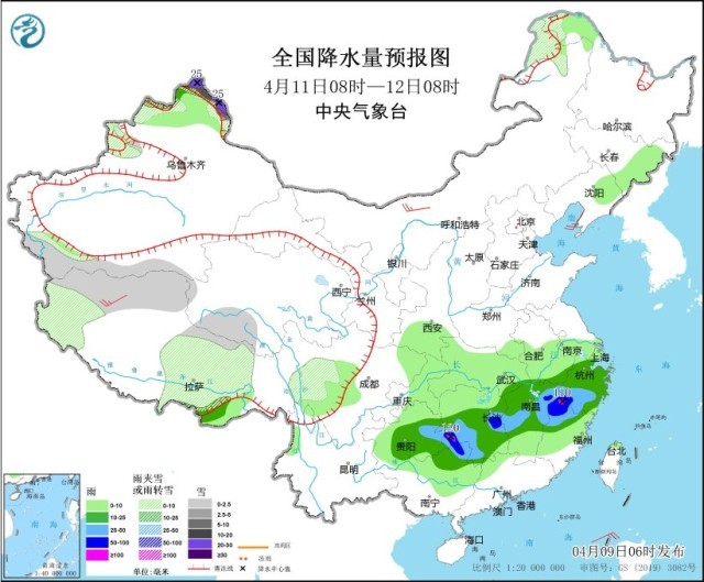 4月11日08時至12日08時,新疆北疆北部、內(nèi)蒙古東北部、黑龍江西北部、西藏西部和中北部、青海南部、川西高原等地部分地區(qū)有小到中雪或雨夾雪,其中,新疆北疆北部高海拔地區(qū)有大到暴雪,局地大暴雪(20~25毫米)。貴州東部、廣西北部、江南大部的部分地區(qū)有中到大雨,其中,湖南東部和西南部、廣西北部、江西東北部、浙江西南部、福建西北部等地部分地區(qū)有暴雨或大暴雨(100~120毫米)。內(nèi)蒙古西北部、西藏西部等地部分地區(qū)有4~5級風。