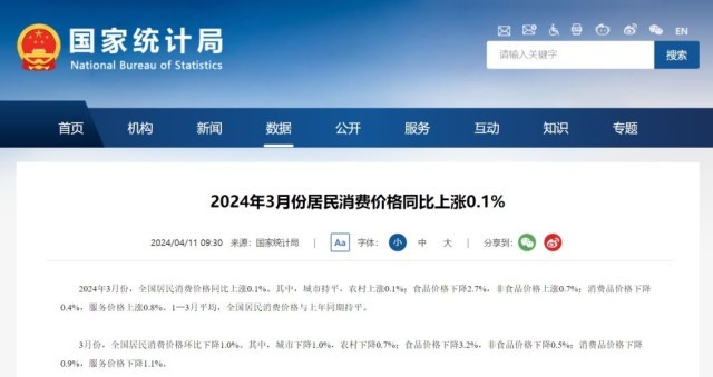 國家統(tǒng)計局:3月份居民消費(fèi)價格同比上漲0.1%