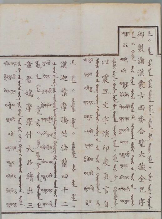 康熙皇帝特別注重刊行蒙古文《甘珠爾》以“利于祭誦”,康熙五十六年(1717年)下令刊刻蒙古文《甘珠爾》。到了乾隆三十二年(1767年),傅恒上書(shū)提出,要讓僧人念經(jīng)念得準(zhǔn),需要標(biāo)明原音、輔音的韻腳和切音,最好能看著漢字就能念出梵音(“禮今教習(xí)僧人持念咒語(yǔ)止,須明曉阿禮嘎禮音韻反切,自能對(duì)漢字而得梵音”)。于是,為方便蒙古地區(qū)僧人念誦咒語(yǔ),《御制滿(mǎn)漢西番合璧大藏全咒》添譯了蒙古文。蒙古文《大藏經(jīng)》是蒙古族歷史文化發(fā)展的里程碑,也是蒙古族已知最大部頭的古籍。在譯經(jīng)過(guò)程中,蒙古文字也得到了充分錘煉與發(fā)展,提高了交流與表現(xiàn)能力。