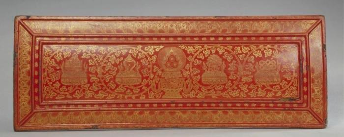 ▲永樂(lè)版藏文《大藏經(jīng)》之紅漆戧金八吉祥紋經(jīng)文夾板(圖片來(lái)源:故宮博物院官網(wǎng))