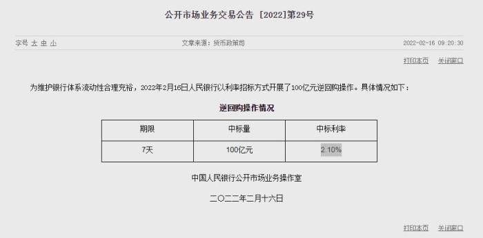 中新財(cái)經(jīng)2月16日電 16日,據(jù)中國人民銀行官網(wǎng)消息,為維護(hù)銀行體系流動(dòng)性合理充裕,2022年2月16日人民銀行以利率招標(biāo)方式開展了100億元逆回購操作,中標(biāo)利率2.10%。(完)