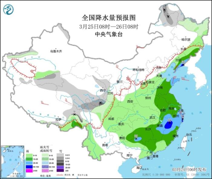 圖2 全國降水量預報圖(3月24日08時-25日08時)