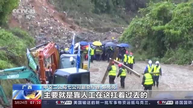 總臺(tái)央視記者 王世玉:我現(xiàn)在的位置是廣西梧州藤縣莫埌村的入口,也是通往事故核心區(qū)的一條必經(jīng)之路。大家看到在我身后的貨車正在進(jìn)行物資的裝卸,裝卸的物資是竹排。為什么要進(jìn)行竹排的運(yùn)輸呢?因?yàn)?現(xiàn)場)從昨天晚上開始就一直在降雨,可以看到路面非常泥濘,在核心區(qū)內(nèi)通行更是非常困難。施工人員想到用竹排鋪滿在路面上,方便物資和人員的運(yùn)輸和通行。