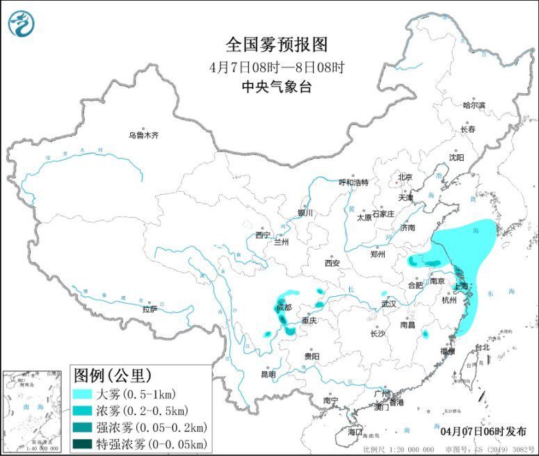 中新網(wǎng)4月7日電 據(jù)中央氣象臺網(wǎng)站消息,預計4月7日早晨至夜間,黃海中部和南部海域、東海西部海域、江蘇東部沿岸海域、長江口附近海域、浙江東部沿岸海域、福建東北部沿岸海域?qū)⒂心芤姸炔蛔?公里的大霧天氣。此外,7日早晨至上午,四川盆地西部和南部、重慶中部、安徽北部、江蘇北部和東部、上海、浙江東北部等地的部分地區(qū)有大霧天氣,局地有能見度不足500米的濃霧(見圖1)。為此,中央氣象臺7日6時繼續(xù)發(fā)布大霧黃色預警。7日至9日,西南地區(qū)多陰雨,西藏東南部、四川南部、云南中西部和北部、貴州西部等地有中到大雨。