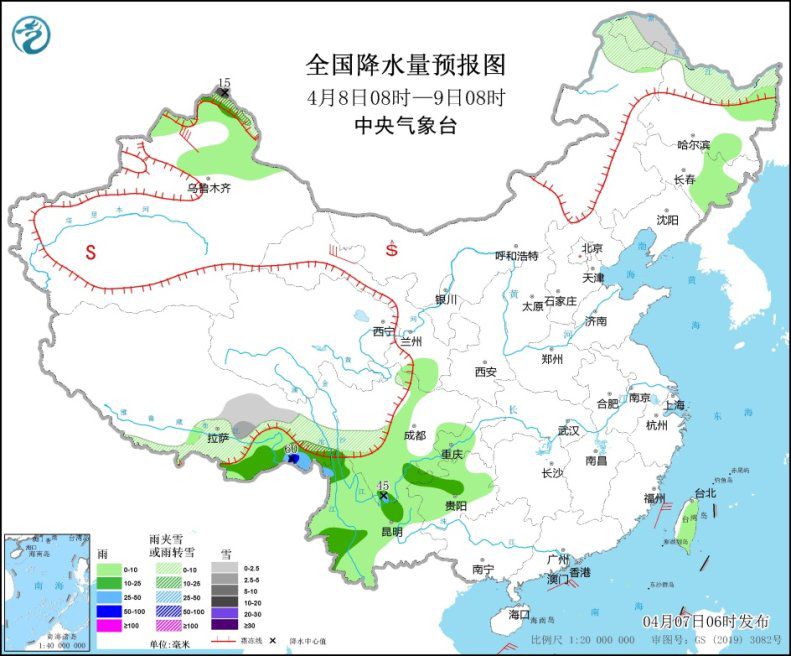 4月8日08時至9日08時,新疆北疆北部、西藏東部、內(nèi)蒙古東北部、黑龍江北部等地的部分地區(qū)有小到中雪或夾雪,其中新疆北疆北部等地的部分地區(qū)有大雪,局地暴雨(10~15毫米);新疆北部、西藏東南部、黑龍江東部、吉林東部、甘肅南部、四川南部、重慶西部、貴州、云南等地的部分地區(qū)有小到中雨,其中云南北部、西藏東南部局地有大雨或暴雨(50~60毫米)。甘肅中西部、西北地區(qū)東北部、內(nèi)蒙古大部、東北地區(qū)中南部、山東半島、西藏中南部等地的部分地區(qū)有4~6級風(見圖3)。