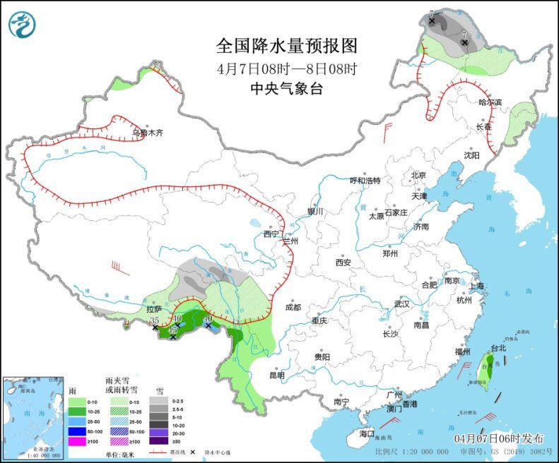4月7日08時至8日08時,新疆北疆北部、西藏東部、青海南部、川西高原西北部、內(nèi)蒙古東北部、黑龍江西北部和東南部、吉林東部等地的部分地區(qū)有小到中雪或雨夾雪,其中內(nèi)蒙古東北部、黑龍江西北部等地局地大雪(5~7毫米);西藏東南部、四川西南部、云南中西部及臺灣島等地的部分地區(qū)有小到中雨,其中西藏東南部等地局地大雨(25~45毫米)。內(nèi)蒙古中東部、西藏中南部等地的部分地區(qū)有4~6級風,其中西藏中部的部分地區(qū)有7~8級風(見圖2)。