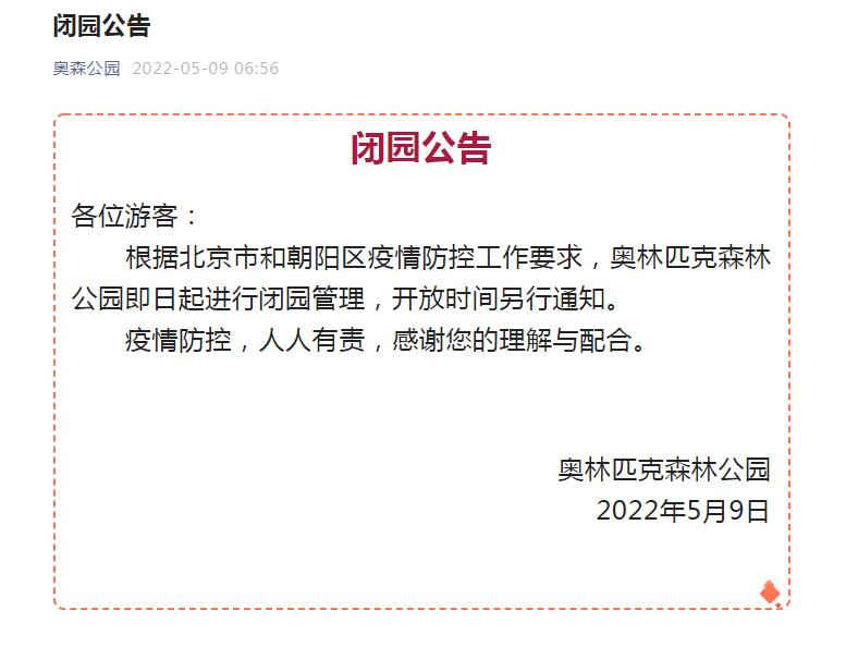 中新網(wǎng)5月9日電 “奧森公園”微信公眾號9日發(fā)布閉園公告,根據(jù)北京市和朝陽區(qū)疫情防控工作要求,奧林匹克森林公園即日起進行閉園管理,開放時間另行通知。
