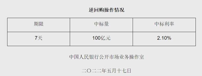 央行5月17日開展100億元逆回購操作 中標(biāo)利率2.10%
