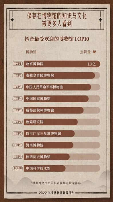 報告顯示,根據(jù)相關(guān)視頻點贊量排序,故宮博物院、秦始皇帝陵博物院、中國人民革命軍事博物館、中國國家博物館、成都武侯祠博物館等入選抖音最受歡迎十大博物館。其中,故宮博物院相關(guān)視頻被抖音網(wǎng)友點贊超過1.3億次。