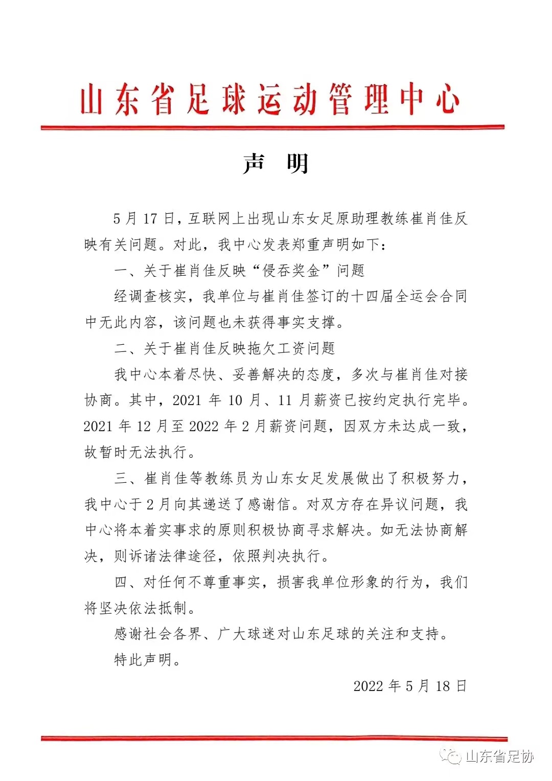 三、崔肖佳等教練員為山東女足發(fā)展做出了積極努力,我中心于2月向其遞送了感謝信。對(duì)雙方存在異議問題,我中心將本著實(shí)事求是的原則積極協(xié)商尋求解決。如無法協(xié)商解決,則訴諸法律途徑,依照判決執(zhí)行。