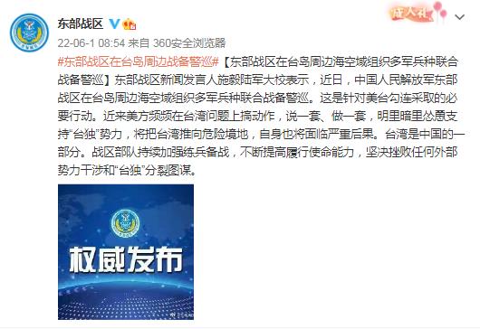 中新網(wǎng)6月1日電 據(jù)中國人民解放軍東部戰(zhàn)區(qū)官方微博1日消息,東部戰(zhàn)區(qū)新聞發(fā)言人施毅陸軍大校表示,近日,中國人民解放軍東部戰(zhàn)區(qū)在臺島周邊??沼蚪M織多軍兵種聯(lián)合戰(zhàn)備警巡。這是針對美臺勾連采取的必要行動。近來美方頻頻在臺灣問題上搞動作,說一套、做一套,明里暗里慫恿支持“臺獨”勢力,將把臺灣推向危險境地,自身也將面臨嚴重后果。臺灣是中國的一部分。戰(zhàn)區(qū)部隊持續(xù)加強練兵備戰(zhàn),不斷提高履行使命能力,堅決挫敗任何外部勢力干涉和“臺獨”分裂圖謀。