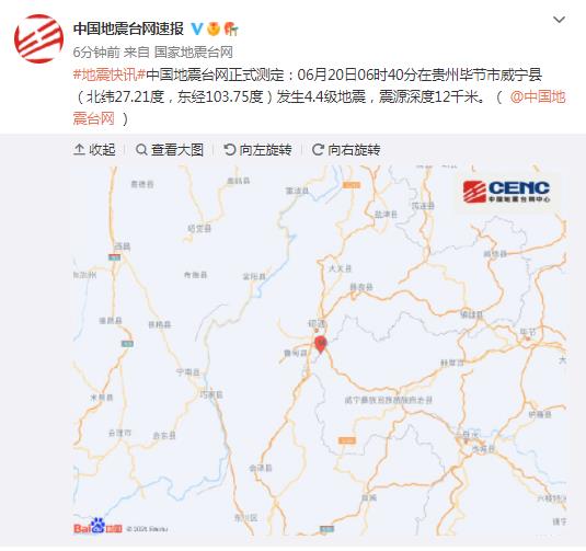 貴州畢節(jié)市威寧縣發(fā)生4.4級(jí)地震 震源深度12千米