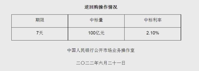 央行6月21日開展100億元逆回購操作 中標利率2.10%