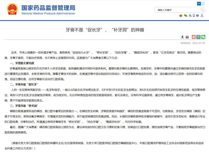 國家藥監(jiān)局:牙膏不是“促長牙”、“補牙洞”的神器