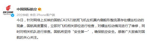 國(guó)航:已對(duì)國(guó)航CA1921航班螺絲松動(dòng)情況進(jìn)行維修