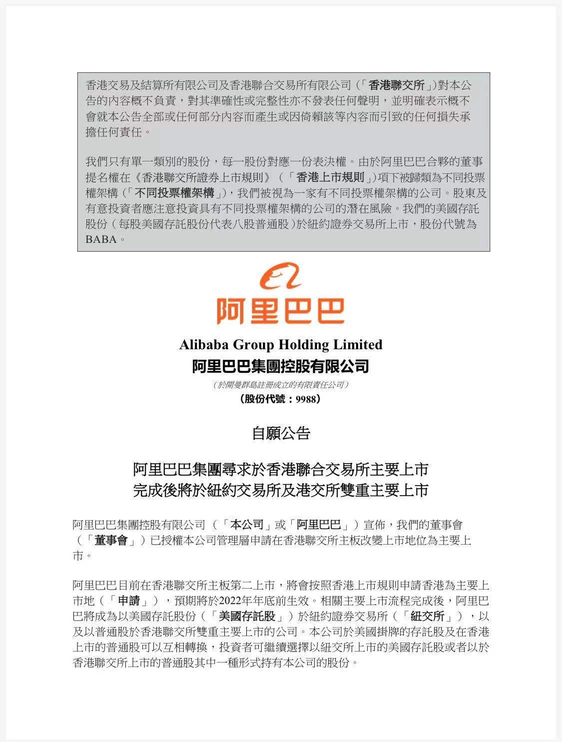 阿里巴巴目前在香港聯(lián)交所主板第二上市,將會(huì)按照香港上市規(guī)則申請(qǐng)香港為主要上市地,預(yù)期將于2022年年底前生效。相關(guān)主要上市流程完成后,阿里巴巴將成為以美國存托股份于紐約證券交易所,以及以普通股于香港聯(lián)交所雙重主要上市的公司。