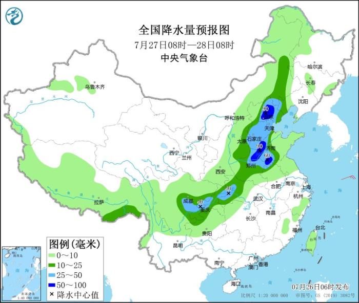 7月27日08時(shí)至28日08時(shí),內(nèi)蒙古東部、華北大部、黃淮、江漢、西南地區(qū)東北部等地部分地區(qū)有中到大雨,其中,河北北部和南部、北京北部、天津北部、山東北部和南部、河南北部和東部、江蘇北部等地部分地區(qū)有暴雨(50~90毫米)(見圖3)。