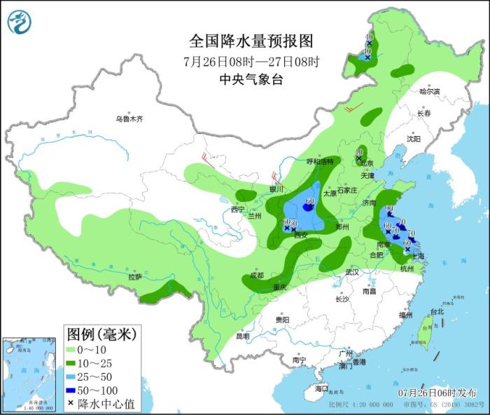7月26日08時(shí)至27日08時(shí),內(nèi)蒙古東北部、西北地區(qū)東北部、華北北部和西部、黃淮東部、江淮東部、湖北西部、西南地區(qū)東北部等地部分地區(qū)有中到大雨,其中,陜西中北部、江蘇中北部等地局地有暴雨(50~90毫米)。內(nèi)蒙古中部、甘肅河西、寧夏北部等地部分地區(qū)有4~5級(jí)風(fēng)(見圖2)。
