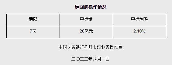 央行8月1日開展20億元逆回購(gòu)操作 中標(biāo)利率2.10%