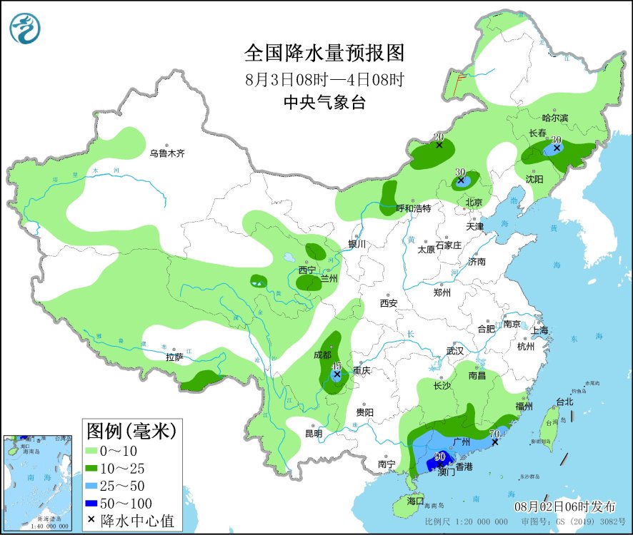 8月3日08時至4日08時,內(nèi)蒙古中部、河北北部、吉林東部、遼寧北部、四川盆地西部和南部、廣西東部、廣東大部、福建東南部等地部分地區(qū)有中到大雨,其中,廣東西南部和東部沿海等地部分地區(qū)有暴雨(50~90毫米)。內(nèi)蒙古東北部部分地區(qū)有4~5級風。
