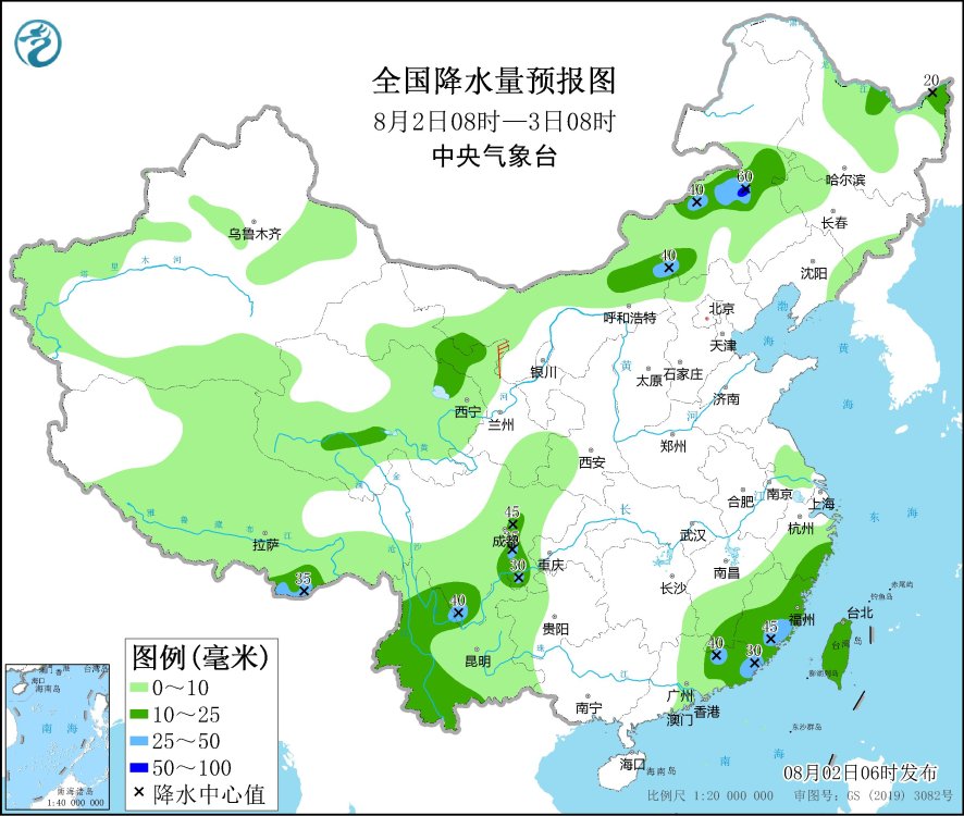 8月2日08時至3日08時,青海北部和南部、內(nèi)蒙古中東部、黑龍江東北部、四川中部和南部、云南西部、江西東南部、浙江東南部、福建東部和南部、廣東東部、臺灣島等地部分地區(qū)有中到大雨,局地暴雨(50~60毫米)。內(nèi)蒙古西部部分地區(qū)有4~5級風。