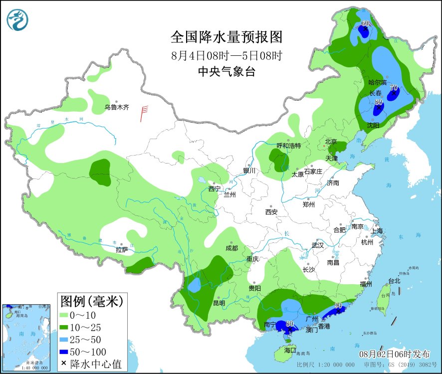 8月4日08時至5日08時,內(nèi)蒙古東北部、東北地區(qū)大部、四川南部、云南中部和西北部、廣西大部、廣東大部等地有中到大雨,其中,內(nèi)蒙古東北部、黑龍江西北部和東南部、吉林中部、遼寧北部、廣西東南部沿海、廣東西南部和東部沿海等地部分地區(qū)有暴雨(50~90毫米)。黑龍江西北部部分地區(qū)有4~6級風。