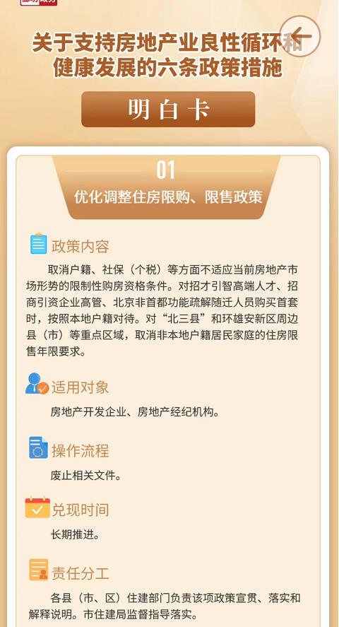 根據(jù)政策明白卡,廊坊優(yōu)化調(diào)整住房限購、限售政策。取消戶籍、社保(個稅)等方面不適應當前房地產(chǎn)市場形勢的限制性購房資格條件。對招才引智高端人才、招商引資企業(yè)高管、北京非首都功能疏解隨遷人員購買首套時,按照本地戶籍對待。對“北三縣”和環(huán)雄安新區(qū)周邊縣(市)等重點區(qū)域,取消非本地戶籍居民家庭的住房限售年限要求。