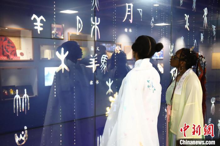 外國(guó)留學(xué)生通過觸摸電子屏幕體驗(yàn)學(xué)習(xí)漢字文化、了解漢字的演變歷程?!∷逑?攝