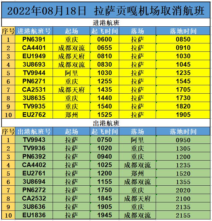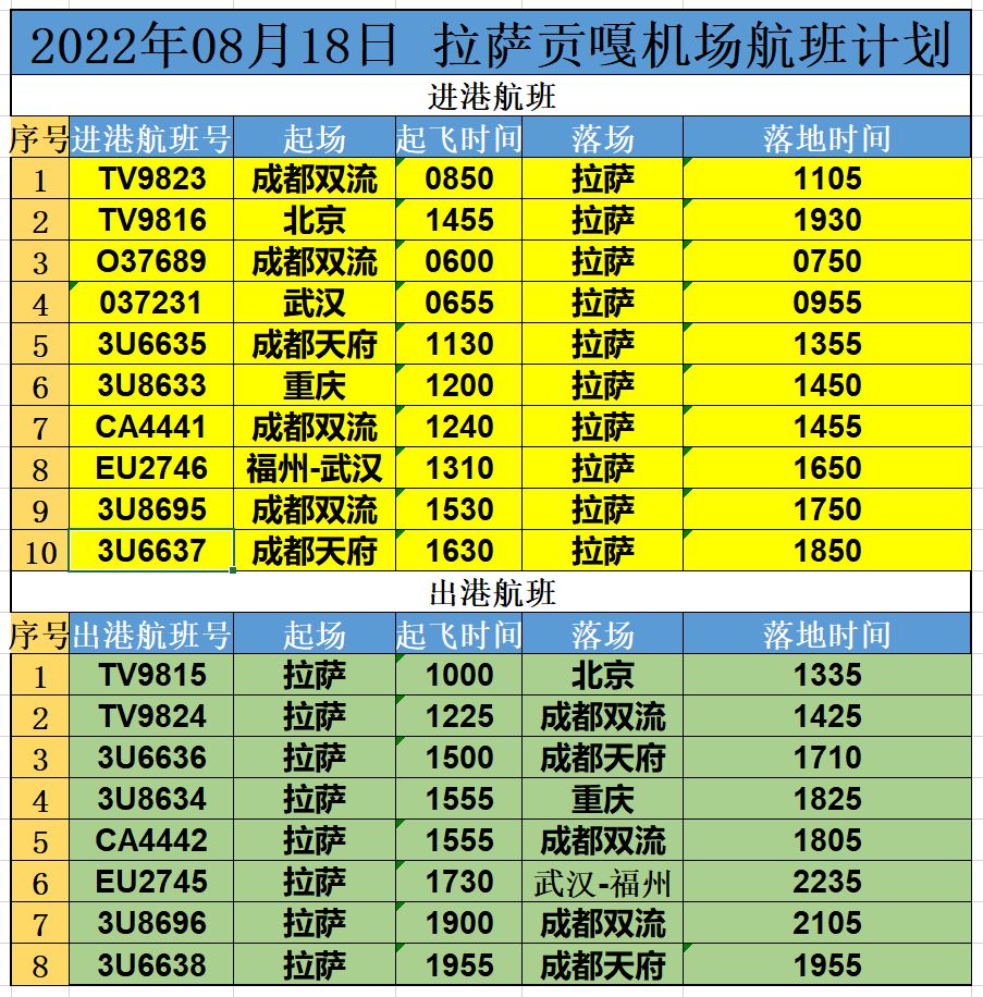 因公共安全原因,8月18日,拉薩貢嘎機場部分航班取消,計劃執(zhí)行進出港航班18架次,分別為: