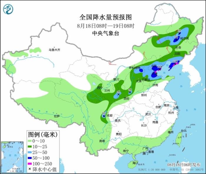 8月18日08時(shí)至19日08時(shí),內(nèi)蒙古中東部、黑龍江西南部、吉林西部、遼寧、青海南部、甘肅東部、寧夏、京津冀、山東北部、四川盆地西南部等地部分地區(qū)有中到大雨,其中,黑龍江西南部、吉林西部、遼寧東部和南部、山西北部、河北中北部、北京、天津等地部分地區(qū)有暴雨或大暴雨(100~180毫米)。內(nèi)蒙古中部和西北部、黑龍江西南部等地部分地區(qū)有4~6級風(fēng)。渤海、黃海北部海域?qū)⒂?~5級、陣風(fēng)6級增大到7~8級、陣風(fēng)9級的偏南風(fēng)。