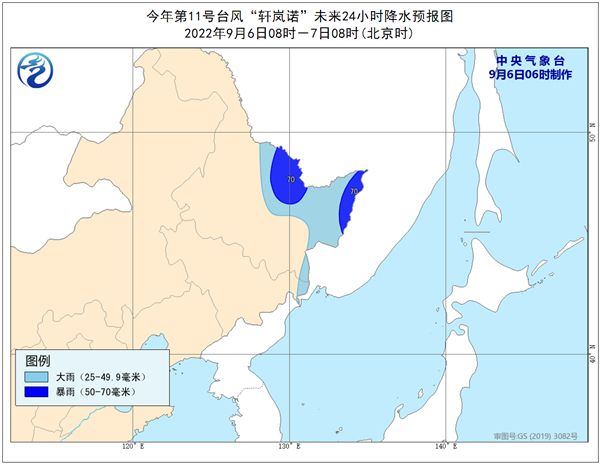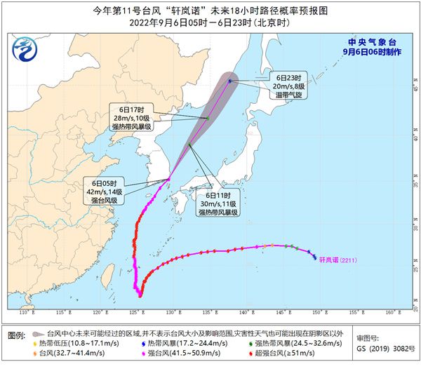 大風(fēng)預(yù)報(bào):9月6日08時(shí)至7日08時(shí),東海東北部、黃海中東部和東南部有6-7級(jí)大風(fēng),陣風(fēng)8-9級(jí);我國(guó)東北地區(qū)東北部有4-5級(jí)風(fēng),陣風(fēng)6-7級(jí),局地8級(jí)。朝鮮海峽、日本海大部有8-11級(jí)大風(fēng),“軒嵐諾”中心經(jīng)過(guò)的附近海面的風(fēng)力有12-14級(jí),陣風(fēng)可達(dá)15-16級(jí)。