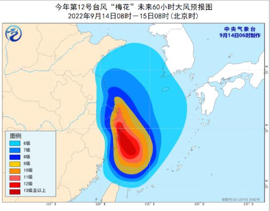 大風(fēng)預(yù)報:9月14日08時至15日08時,東海大部及釣魚島附近海域、黃海中南部海域、長江口區(qū)、杭州灣以及臺灣島北部沿海、福建北部沿海、山東南部沿海、浙江東部、上海、江蘇東部沿海和地區(qū)將有6-8級大風(fēng),陣風(fēng)9-11級,其中東海中西部海域、浙江中北部沿海、上海沿海、江蘇東南部沿海、杭州灣、長江口區(qū)將有9-11級大風(fēng),陣風(fēng)12-14級,“梅花”中心經(jīng)過的附近海面或地區(qū)的風(fēng)力有12-14級,陣風(fēng)可達(dá)15-16級。