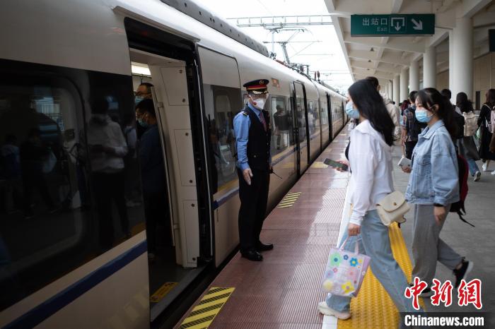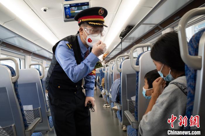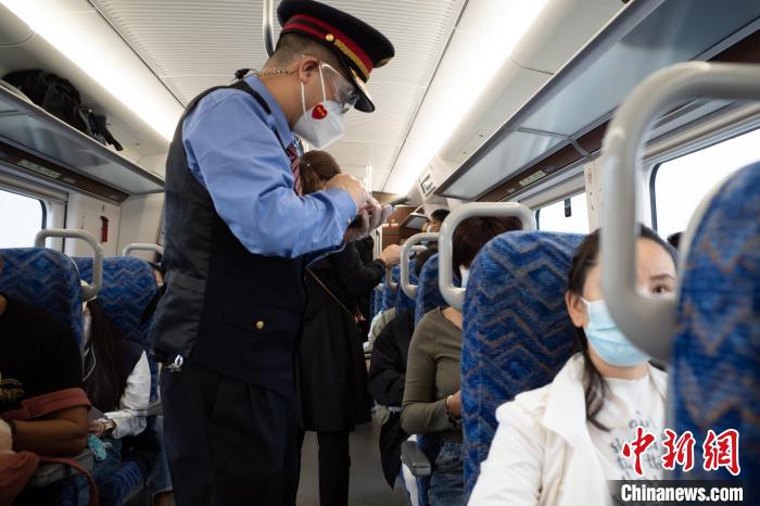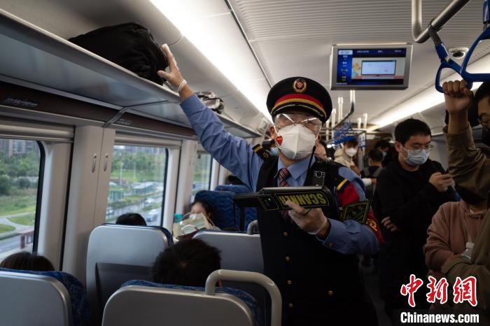 “請(qǐng)保管好自身財(cái)物,看管好小孩,照顧好老人,上下車(chē)注意腳下安全。”數(shù)百名乘客陸續(xù)上車(chē)后,鐘靜開(kāi)始在車(chē)廂里巡視。疫情防控期間,他要提醒大家戴好口罩。遇到行李架上行李擺放不規(guī)范,他要?jiǎng)邮终?。同時(shí),他還負(fù)責(zé)整列4節(jié)車(chē)廂的查票、補(bǔ)票工作。