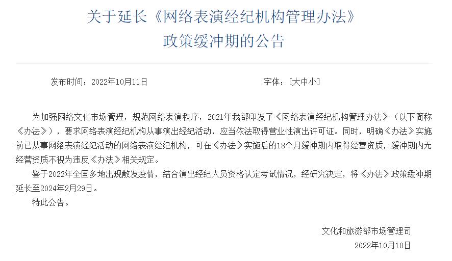 文旅部:延長《網(wǎng)絡(luò)表演經(jīng)紀機構(gòu)管理辦法》政策緩沖期
