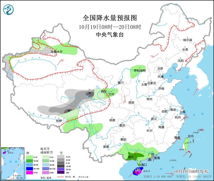 10月19日08時至20日08時,新疆沿天山地區(qū)和南疆西部山區(qū)、西藏東北部、青海中南部等地部分地區(qū)有小到中雪,其中,西藏東北部、青海東部等地部分地區(qū)有大雪(5~8毫米)。廣西南部沿海、海南島等地部分地區(qū)有中到大雨,其中,海南島等地部分地區(qū)有暴雨或大暴雨(100~120毫米)。內(nèi)蒙古東南部、遼東半島、新疆南疆盆地、陜西中部、廣西東南部等地部分地區(qū)有4~6級風(fēng);臺灣海峽、南海北部和中西部偏北海域的風(fēng)力可達(dá)10~11級、陣風(fēng)12~13級,臺風(fēng)中心經(jīng)過的附近海域風(fēng)力可達(dá)12~14級、陣風(fēng)15~16級。