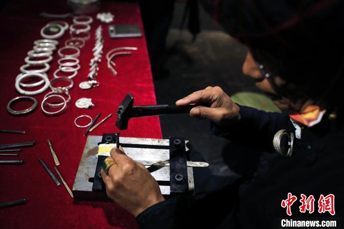 彝族銀飾制作技藝國(guó)家級(jí)非遺傳承人勒古沙日正在打制銀器?!⊥趵?攝